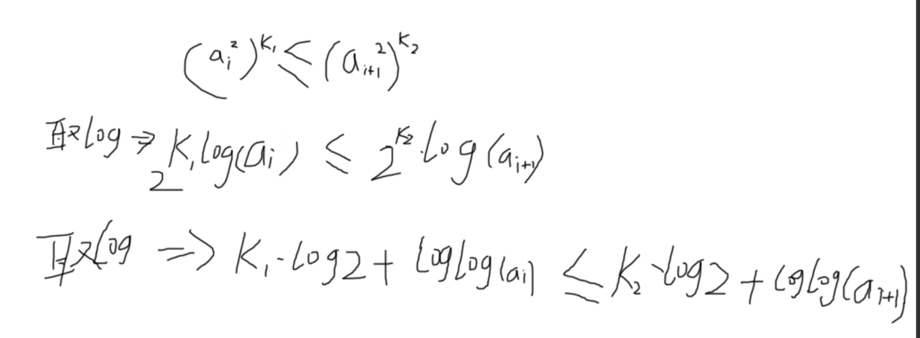 对于前后两个数,我们可以假设前面的数已经平方过 k1 次,我们当前数要平方 k2 次,那么就存在如上图所示的关系,由于我们如果用幂次的话绝对会爆数据,而我们并不需要知道具体的值,我们只需要知道大小关系,所以我们可以通过不断地取 log 来缩短数据大小,最后就是上图所示的关系