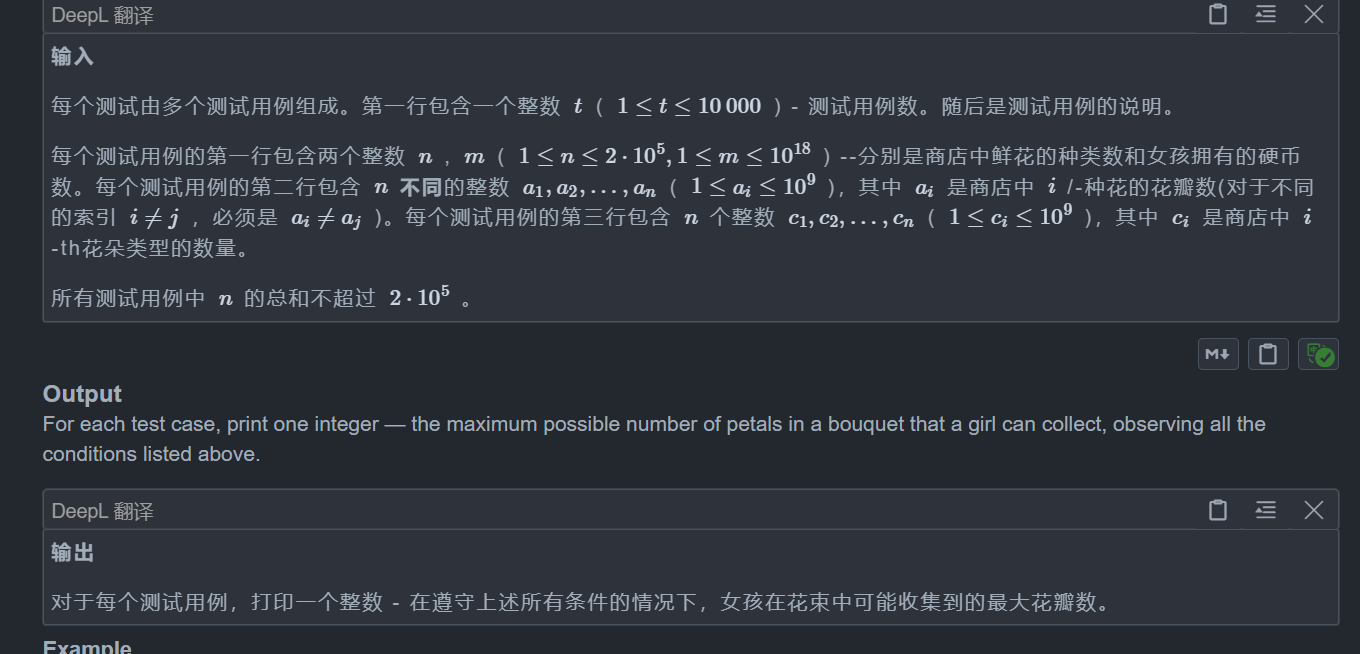 也就是说我们现在的操作就是:先尽量买 x 花,如果有剩,看看能不能买 x+1 花,这样就达到了第一阶段的答案,随后我们再尝试将 x 花换成 x+1 花,最后将能换的都换完后就是第二阶段的答案了,显然第二次的答案一定大于第一次的答案,所以我们直接改变即可