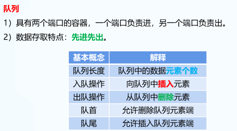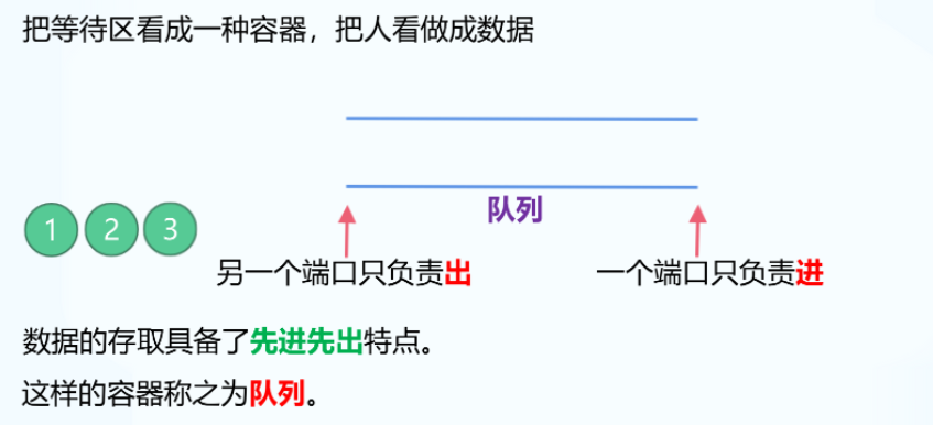 1)具有两个端口的容器,一个端口负责进,另一个端口负责出。